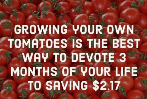 Truer words could not be said. I love the meme below about basically investing hundreds of dollars and time instead of going to the store. But all jokes aside, we all know a homegrown tomato is pretty much a different type of food than a store-bought tomato. They can’t compare. We should come up with new names for each.